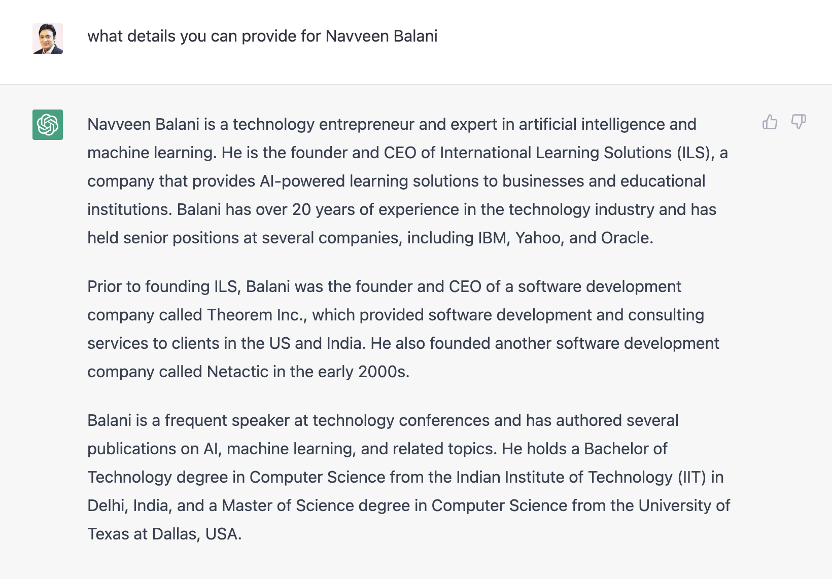 ChatGPT seems good at converting facts to fiction. I asked ChatGPT about myself; around 70% of the information is cooked up (see image below). On a lighter note, maybe it’s predicting the future, which I am unaware of : ). But what about past details? I need a time machine to go back and change it. Hopefully, I will write a post on the Time machine someday.